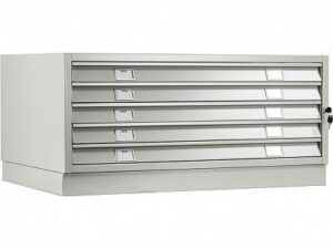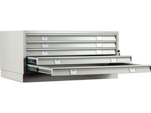 Горизонтальные картотечные шкафы представляют собой модели с широкими и низкими ящиками. Они удобны для хранения больших объемов документов, папок и архивных материалов.