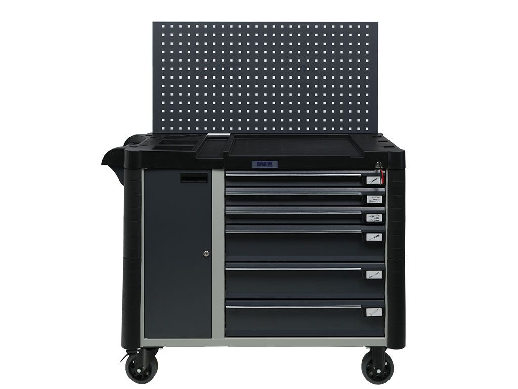 - Топ (пластик черного цвета) оснащён ложементами под инструменты для организации, хранения и удобства использования во время выполнения работ. Нагрузка на ТОП – 40 кг
