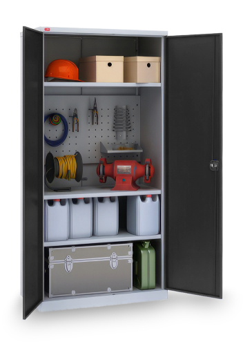 Инструментальный шкаф ИП-1/6 - вариант возможной комплектации (инструменты на фото в комплектацию не входят). К существующей комплектации можно добавить дополнительные элементы по желанию. Инструментальные шкафы оборудованы замком повышенной секретности и ригельной системой запирания. Варианты покрытия: СИНИЙ - Полимерное порошковое покрытие корпус светло-серого цвета (RAL 7035) двери синие (RAL 5002). ГРАФИТ - Полимерное порошковое покрытие корпус светло-серого цвета (RAL 7035) двери черные (Муар текстурная RAL 7021).