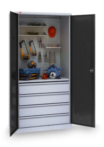 Инструментальный шкаф ИП-1/7 - вариант возможной комплектации (инструменты на фото в комплектацию не входят). К существующей комплектации можно добавить дополнительные элементы по желанию. Инструментальные шкафы оборудованы замком повышенной секретности и ригельной системой запирания. Варианты покрытия: СИНИЙ - Полимерное порошковое покрытие корпус светло-серого цвета (RAL 7035) двери синие (RAL 5002). ГРАФИТ - Полимерное порошковое покрытие корпус светло-серого цвета (RAL 7035) двери черные (Муар текстурная RAL 7021).