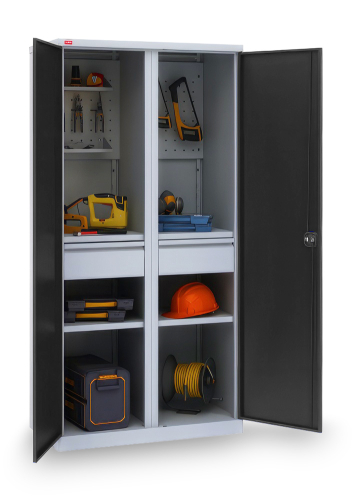 Инструментальный шкаф ИП-2/1 - вариант возможной комплектации (инструменты на фото в комплектацию не входят). К существующей комплектации можно добавить дополнительные элементы по желанию. Инструментальные шкафы оборудованы замком повышенной секретности и ригельной системой запирания. Варианты покрытия: СИНИЙ - Полимерное порошковое покрытие корпус светло-серого цвета (RAL 7035) двери синие (RAL 5002). ГРАФИТ - Полимерное порошковое покрытие корпус светло-серого цвета (RAL 7035) двери черные (Муар текстурная RAL 7021).
