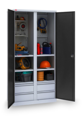 Инструментальный шкаф ИП-2/2 - вариант возможной комплектации (инструменты на фото в комплектацию не входят). К существующей комплектации можно добавить дополнительные элементы по желанию. Инструментальные шкафы оборудованы замком повышенной секретности и ригельной системой запирания. Варианты покрытия: СИНИЙ - Полимерное порошковое покрытие корпус светло-серого цвета (RAL 7035) двери синие (RAL 5002). ГРАФИТ - Полимерное порошковое покрытие корпус светло-серого цвета (RAL 7035) двери черные (Муар текстурная RAL 7021).
