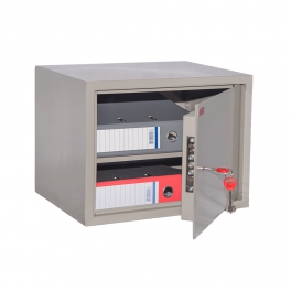 Шкаф представляет собой цельносварную металлическую конструкцию прямоугольной формы, соединение элементов которой выполнены методом сварки сплошным швом по контуру прилегания элементов. Корпус и дверь шкафа изготовлены из стального листа толщиной 1,5мм. Дверь изнутри усилена панелью коробчатого сечения из стального листа толщиной 0,8 мм. В двери шкафа установлен врезной 8-ми сувальдный замок фирмы «ПРО САМ» (Россия). В шкафу КБС-02 располагается 1 съемная регулируемая по высоте полка. Петли шкафа – внутренние. Окраска — полимерное порошковое покрытие, цвет серый.