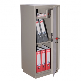 Шкаф представляет собой цельносварную металлическую конструкцию прямоугольной формы, соединение элементов которой выполнены методом сварки сплошным швом по контуру прилегания элементов. Корпус и дверь шкафа изготовлены из стального листа толщиной 1,5 мм. Дверь изнутри усилена панелью коробчатого сечения из стального листа толщиной 0,8 мм. В двери шкафа установлен врезной 8-ми сувальдный замок фирмы «ПРО САМ» (Россия).В верхней части шкафа КБС-041т — располагается отсек ограниченного доступа (трейзер), запираемый на замок «почтового» типа и 1 съемная регулируемая по высоте полка. Шкаф имеет подиум (подставку) высотой 47 мм для возможности размещения его вплотную к стене. Петли шкафа – внутренние. Окраска — полимерное порошковое покрытие, цвет серый.
