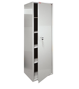 Шкаф представляет собой цельносварную металлическую конструкцию прямоугольной формы, соединение элементов которой выполнены методом сварки сплошным швом по контуру прилегания элементов. Корпус и дверь шкафа изготовлены из стального листа толщиной 1,2 мм. Дверь изнутри усилена панелью коробчатого сечения из стального листа толщиной 0,8 мм. В двери шкафа установлен врезной 6-ти сувальдный замок фирмы «ПРО САМ» (Россия). В шкафу КБС-05н располагаются 4 съемные регулируемые по высоте полки. Петли шкафа – внутренние. Окраска — полимерное порошковое покрытие, цвет серый.
