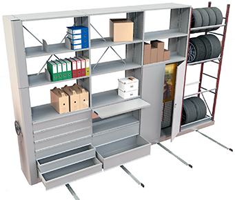 - конструкция мобильного стеллажа устанавливается на колесную базу и рельсовую систему;