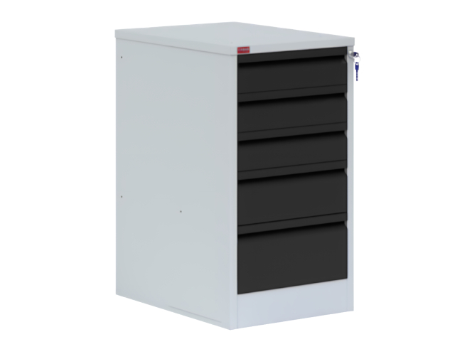 Тумба для металлического верстака может использоваться как с верстаком, так и как отдельный элемент металлического мебели. Состоит из 5-ти выдвижных ящиков на телескопических направляющих, запирающихся на общий замок. Нагрузка на ящик до 30 кг. Варианты покрытия: СИНИЙ - Полимерное порошковое покрытие корпус светло-серого цвета (RAL 7035) двери синие (RAL 5002). ГРАФИТ - Полимерное порошковое покрытие корпус светло-серого цвета (RAL 7035) двери черные (Муар текстурная RAL 7021).