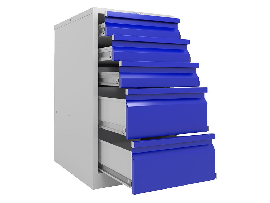 - Тумба укомплектована 5-ю выдвижными ящиками. Телескопические направляющие. Нагрузка на ящик 30 кг. Все ящики закрываются на центральный ключевой замок.